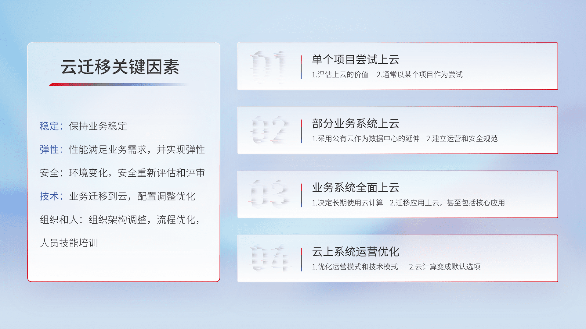结合实际业务,,从规划设计、、、、云平台选型、、、、云原生改造、、、、数据迁移、、集成交付,,,,迁移全过程为客户识别最佳上云路径,,,,做好风险识别管理,,,设计网络架构、、身份权限、、安全审计合规、、操作审计、、、日志审计、、、监控告警策略、、、、多站点容灾设计等,,,,对云上基础设施进行整体规划,,提升IT治理水平,,,以满足弹性、、、、高可用、、、高性能的需求。。