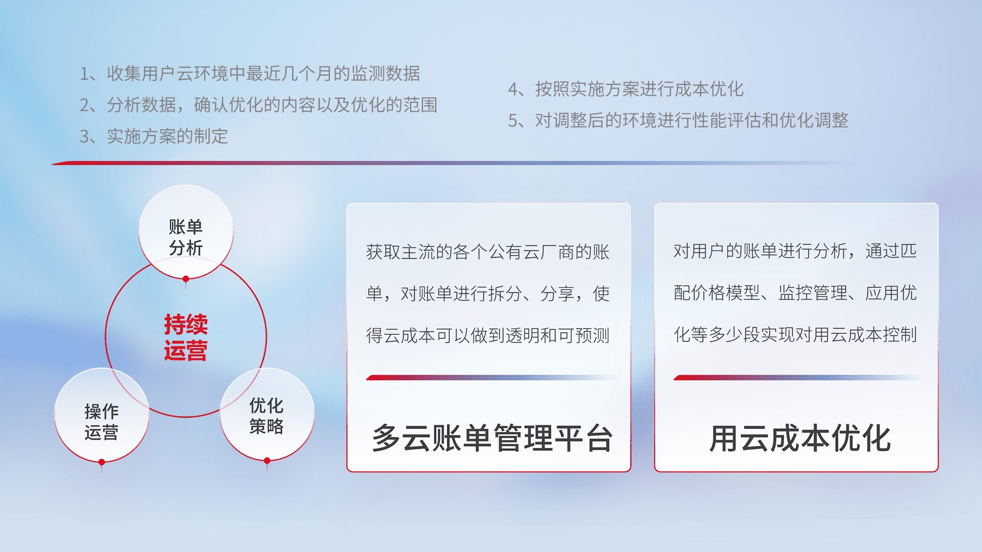 通过多云纳管,,,以统一的资源数据模型把客户的云资源进行抽象和封装,,进而实现对多云资源的统一操作,,,,保障云资源管理的可靠性、、、、稳定性与可用性。。量身定制化运维内容,,,配置、、开发运维、、、补丁管理、、、备份、、、、监控、、、认证和访问管理、、、审计和日常巡检等,,保障在用云过程中的可靠度,,,,稳定度以及高可用率。。。。